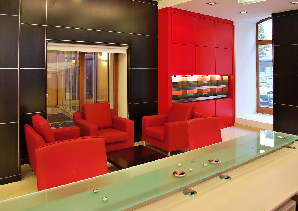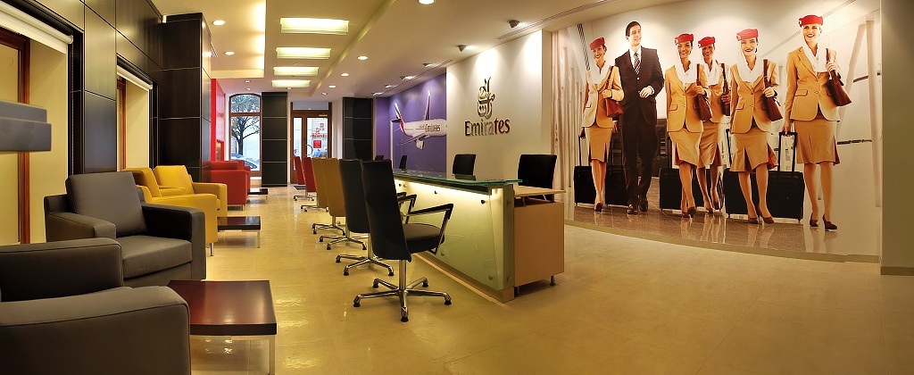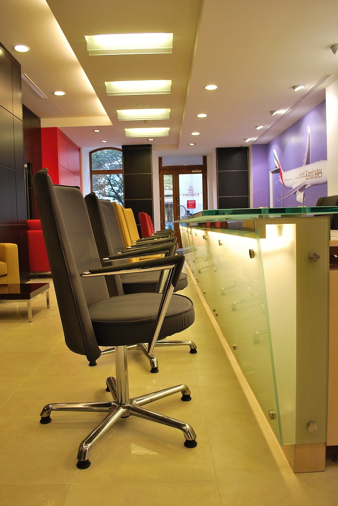 Výstavba pobočky letecké společnosti EMIRATES se zákaznickým centrem v 1. NP a kancelářskými prostorami ve 2. NP, Slovanský dům, Na Příkopech 859/22, Praha 1. Součástí výstavby byla i dodávka vestavěného interiéru.